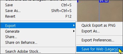 위에서와 같이 여러개의 조각으로 나눈 다음 일괄적으로 모든 조각을 저장하려면 파일 메뉴를 누른 다음 Export > Save for Web(Legacy)를 선택해 주면 됩니다.