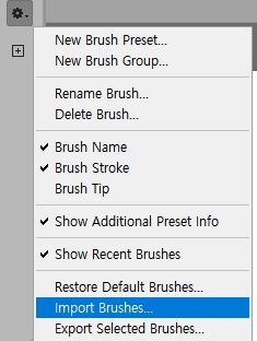톱니바퀴를 클릭하면 나오는 메뉴에서 import Brushes를 클릭하여 좀 전에 다운로드한 브러시 파일을 선택해 줍니다.