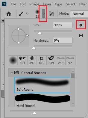 이제 다시 포토샵으로 돌아와 좌측의 포토샵 도구막대에서 브러시가 선택된 상태에서 상단의 브러시 사이즈 옆의 드롭다운 화살표를 클릭합니다.