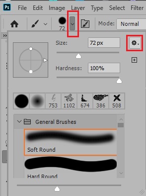 먼저 다운로드한 해당 브러시를 불러와야 합니다. 브러시 툴을 선택한 다음 상단의 브러시 크기 옵션 옆에 있는 드롭다운 화살표를 클릭합니다. 그다음 톱니바퀴 모양을 클릭해 import brushes를 선택하고 브러시를 다운로드했던 폴더를 찾아 해당 브러시들을 선택해 주면 포토샵의 브러시 항목으로 들어오게 됩니다. 이렇게 한번 포토샵으로 들어온 브러시는 다운로드한 원본이 삭제되더라도 포토샵에는 남아 있게 됩니다.