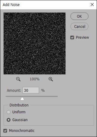 다음으로, 상단의 필터 메뉴에서 Nose > Add Nose를 선택해 줍니다. 아래의 이미지에서 처럼 가우시안을 선택하고 Monochromatic을 선택하여 칼러가 아닌 흑백 점만으로 구성되게 옵션을 지정해 줍니다.