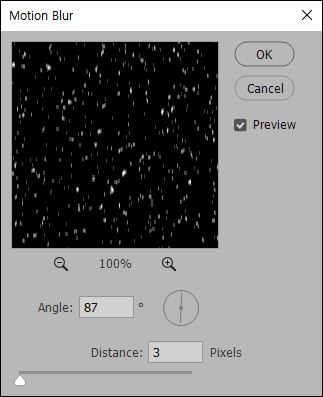 이제 드디어 마지막 단계로 중력의 영향을 받아 아래로 내리는 눈의 모양을 나타내 줄 속도감만 주면 됩니다. 필터의 Blur > Motion Blur를 클릭하고 눈이 내리는 각도와 Distance 픽셀 값을 적당하게 맞춰줍니다.