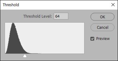 아직까지는 눈으로 보이지 않고 오래된 TV 화면 같아 보입니다. 눈발의 간격을 조금 벌리고 선명도를 높이기 위해 Image > Adjusments > Threshold를 클릭합니다. Threshold Level을 좌우로 드래그하면서 내리는 눈 같아 보이는 적당한 값을 선택해 줍니다. 원본 화면의 변화를 보면서 작업하면 됩니다.