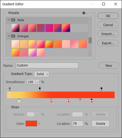 그라디언트 편집창에서 새로운 그라디언트를 만들어 등록하거나 기존의 그라디언트를 편집할 수 있습니다. 이 편집창에서 가장 중요한 것은 중간에 있는 검은색의 투명 정지점(Opacity Stop)과 색상 정지점(Color Stop)이 있는 기다란 바입니다.
