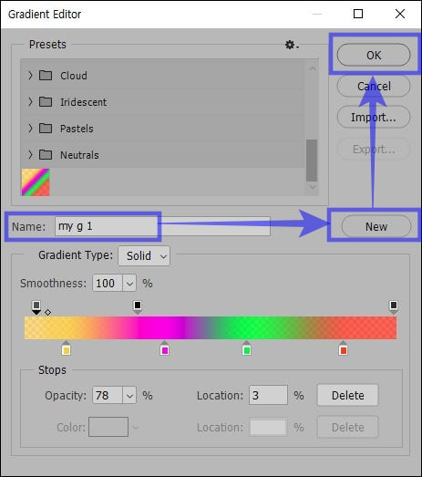그라디언트의 사용자 설정이 모두 끝나고 적당한 이름을 지정해 준 다음 우측 중간의 New라는 버튼을 클릭하면 자동으로 현재의 그라디언트 폴더 위치에 저장됩니다. Presets 폴더 항목에서 종류별로 분류된 폴더를 모두 닫은 상태에서 New라는 버튼을 눌러 주면 폴더의 최상위에 위치해져 그라디언트 편집기를 열면 바로 눈에 들어오므로 나중에 사용하기 편리합니다.