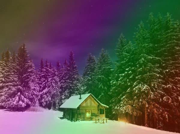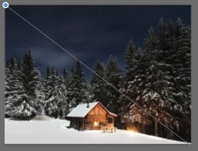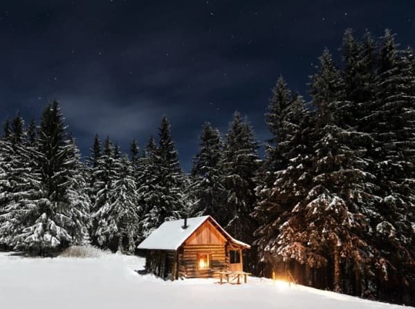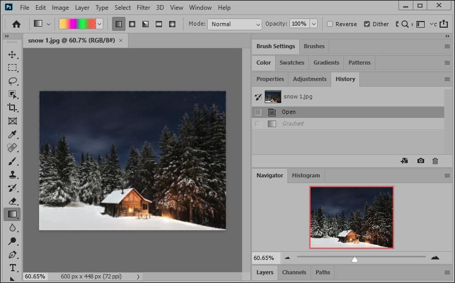 포토샵에서 그라디언트를 덮어줄 적당한 이미지를 불러 옵니다. 저는 이전 포스팅에서 눈 내리는 오두막집을 표현할 때 썼던 겨울 숲 속의 조그만 오두막집 이미지를 불러왔습니다.
