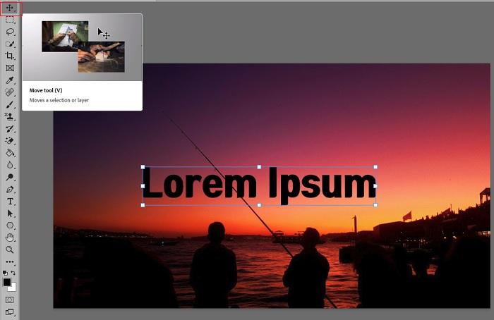 포토샵에서 배경 이미지에 문장을 입력할 경우 그 이동은 문자 입력 폼에서도 가능하지만, 좌측 도구 막대의 가장 상단에 위치한 Move Tool(이동 툴을 이용할 경우) 문자의 크기와 이동 두 가지를 모두 마우스 드래그만으로 작업할 수 있으므로 효율이 좋습니다.