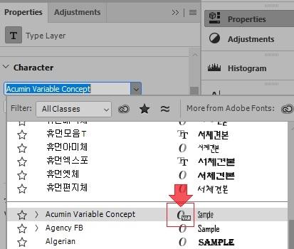 폰트 정보에서 Var이라는 표시가 붙어 있는 폰트들의 경우에는 Properties 창에서 마우스 좌우 드래그만으로도 굵기, 폭, 기울임 등의 폰트 정보를 원하는 만큼 변형시킬 수 있는 글꼴들입니다.