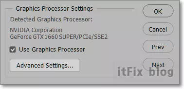 - Advanced : GPU를 최대한 사용합니다. 이 옵션이 기본값이며, 당연히 포토샵 구동시에는 이 옵션을 사용하여 빠르게 처리하도록 하는 것이 좋습니다.