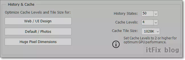캐시 레벨을 지정할 수 있습니다. 세개의 버튼이 있는 데 가장 아래쪽에 있는 옵션의 캐시 레벨이 가장 높습니다. 기본값은 중간에 있는 Default/Photos로 선택되어 있으나, 고화질 이미지 작업의 경우에는 가장 아래쪽을 선택하는 것이 좋습니다.