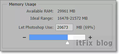 만약 포토샵 구동시 메모리 부족 현상으로 버퍼링이 존재한다고 느낀 다면 눈금을 플러스 표시 쪽으로 드래그하여 포토샵에 대한 메모리 할당량을 늘릴 수 있습니다.