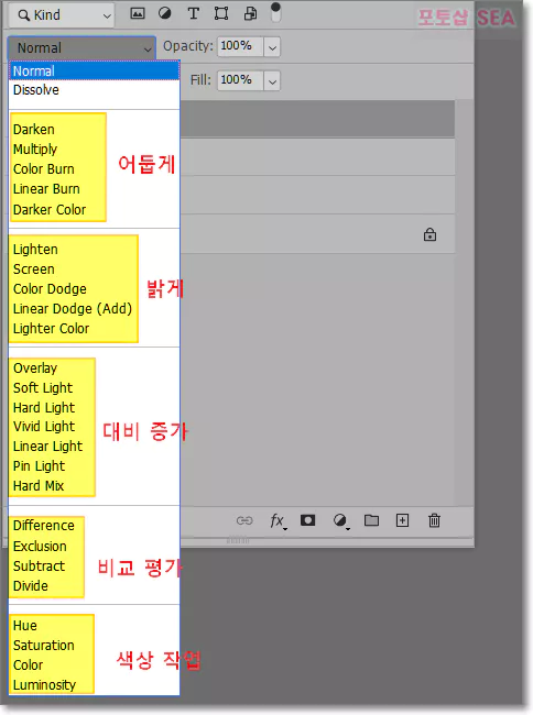 레이어 창에서 블렌딩 모드 옵션들은 아래의 이미지에서 처럼 비슷한 기능을 하는 것 들끼리 묶어 두었습니다.