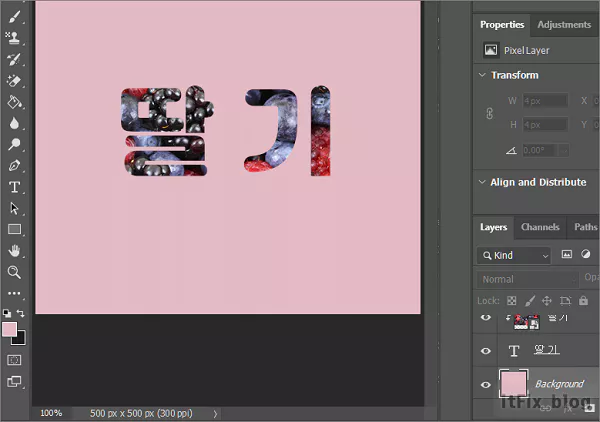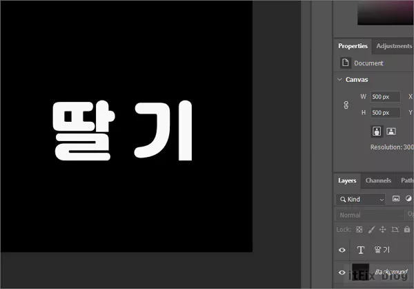 4. 글씨의 몸체 부분이 딸기 이미지로 가득 채워집니다. 이 상태에서 백그라운드 레이어를 선택합니다. 배경 색상인 검은색이 생각보다 좋지 않은 디자인 상태를 보이므로 원하는 색상을 전경색으로 지정한 다음 전경색으로 채우기 단축키인 Alt+Delete 키를 눌러 줍니다.