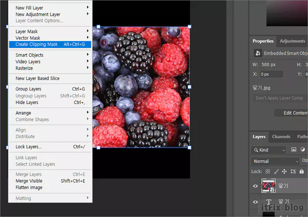 3. 포토샵의 상단 메뉴 중 Layer > Create Clipping Mask를 클릭합니다. 딸기 레이어가 선택된 상태라야 클리핑 마스크 만들기 메뉴가 활성화됩니다.
