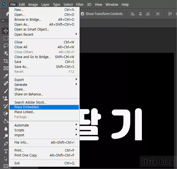 2. 상단 메뉴의 File > Place Embedded를 클릭하고 딸기.jpg를 불러옵니다. 딸기 이미지를 더블 클릭하면 불러오기가 완료됩니다.