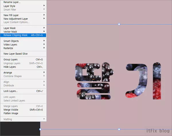 만약, 작업 도중 클리핑 마스크를 설정하기 이전 상태로 되돌아 가려면 딸기 레이어가 선택된 상태에서 Layer > Release Clipping Mask를 클릭하거나 클리핑 마스크 해제 단축키인 Alt+Ctrl+G를 눌러 줍니다. 당연히 다시 클리핑 편집 상태로 되돌아 가려면 선택 취소 단축키인 Ctrl+Z를 입력하면 됩니다.