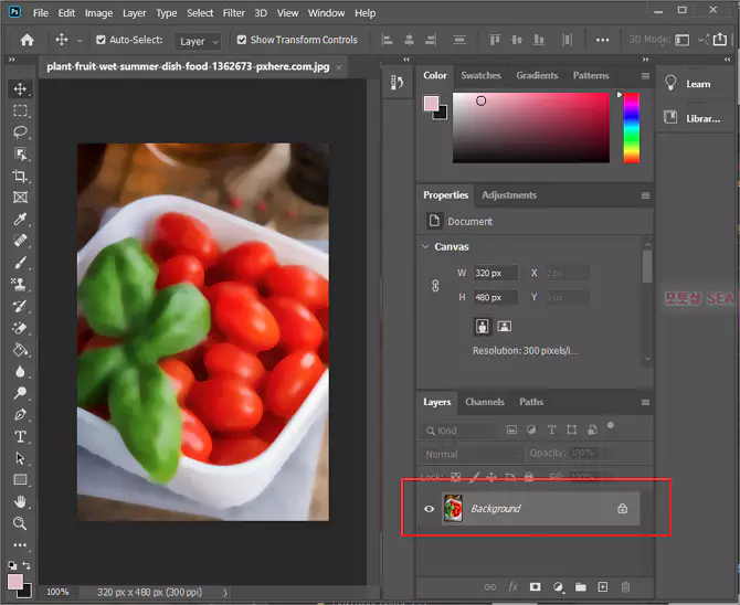 그런데, 레이어 창을 보면 백그라운드 레이어 하나만 존재합니다. 직접 원본 이미지에 변형이 이루어지고 있다는 말이 됩니다.