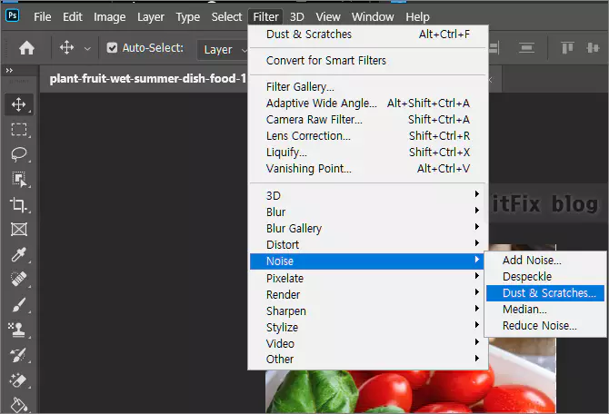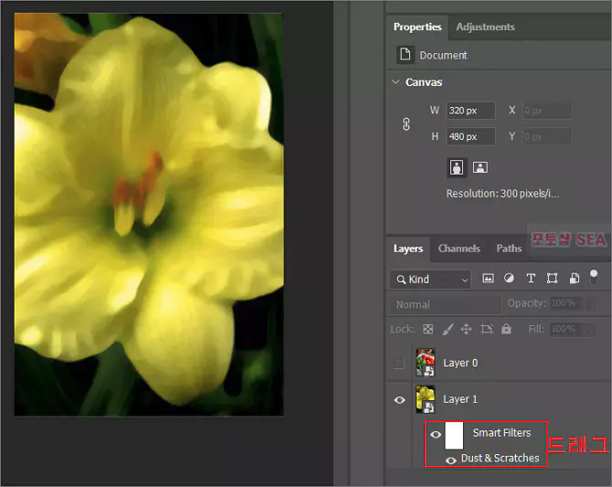 Filter > Noise > Dust & Scratches 효과를 Radius 7, Threshold 7로 주게 되면 수채화 효과가 적용됩니다.