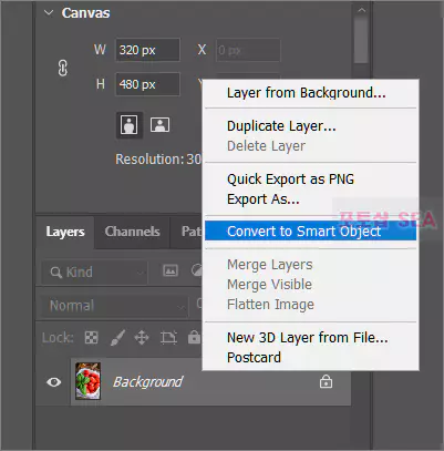 그런데, 만일 이 이미지를 불러온 다음 가장 먼저 레이어 옵션창에서 마우스 우클릭한 다음 'Convert to Smart Object'를 눌러 스마트 오브젝트로 변환시키면 필터 적용 시 레이어 옵션 창이 조금 달라집니다.