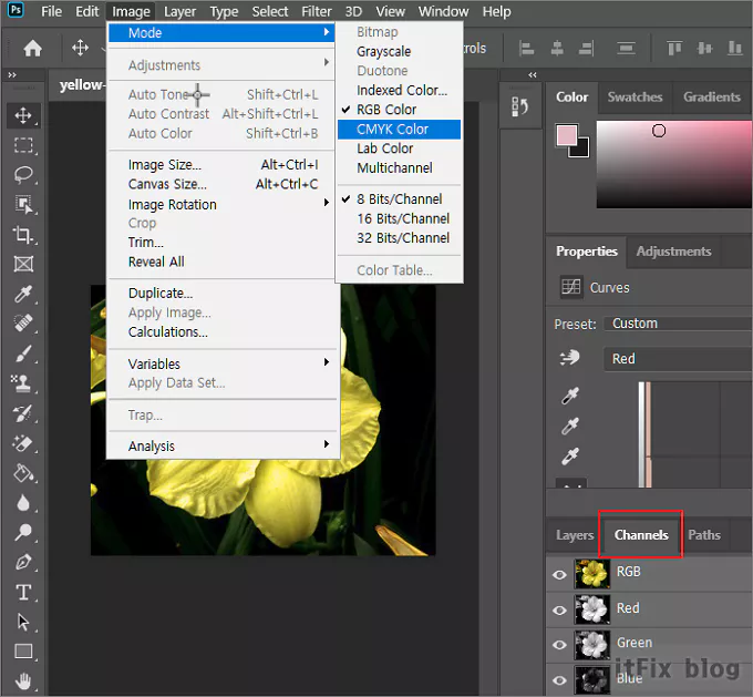 상단의 메뉴에서 Image > Mode > CMYK Color 로 체크 표시를 변경해 주도록 합니다. 이렇게 하면 우측 하단의 RGB 채널 도구들도 CMYK용 채널 도구들로 바뀌게 됩니다.