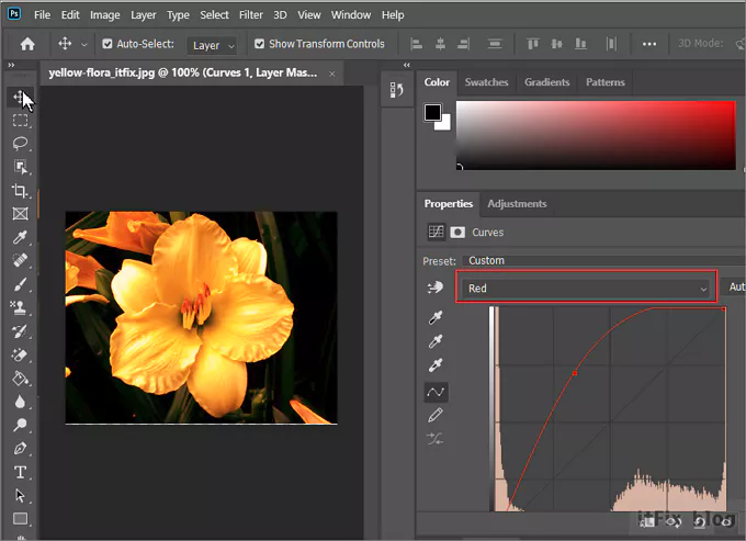 Curves 도구를 클릭하면 RGB 메뉴가 보이는 데 드롭다운 메뉴를 클릭하면 Red, Green, Blue의 개별 색상 채널들도 선택하여 조정이 가능한 것을 볼 수 있습니다. Red를 선택한 다음 곡선을 위쪽으로 끌어올리면 Red 채널에만 적용되지만 전체적으로 이미지의 색감에서 붉은색이 강해진 것을 확인할 수 있습니다.
