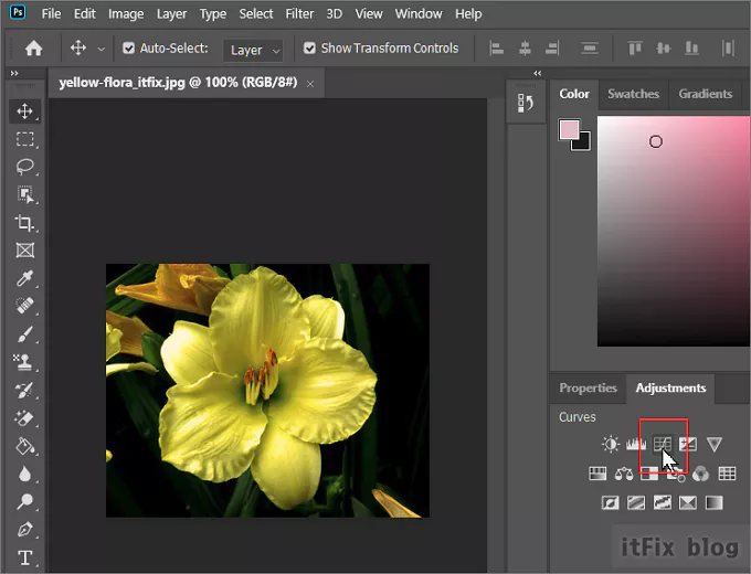 포토샵에서 위의 노란색 꽃 이미지를 불러온 다음 RGB 채널을 만질 경우 이미지의 색상 변화를 관찰해 보려고 합니다. Adjustments 탭을 누르면 여러 가지의 도구가 보이는 데 이 중에서 Curves 도구를 클릭합니다.