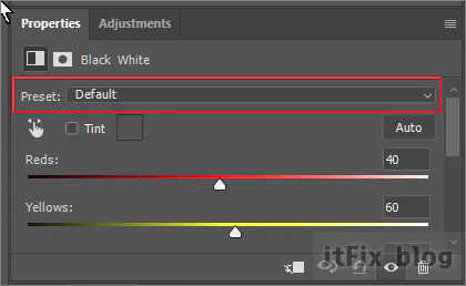 위와 같이 tint에 체크한 다음 직접 색조를 입힐 수도 있지만, tint를 선택하지 않은 상태에서 이미 준비되어 있는 여러 가지 흑백사진 효과를 사용하는 방법이 있으며 tint가 해제된 상태에서 보이는 Preset(사전 설정) 메뉴를 이용할 수도 있습니다. Preset 메뉴에는 다양한 느낌의 흑백 사진 색조효과들이 준비되어 있습니다.