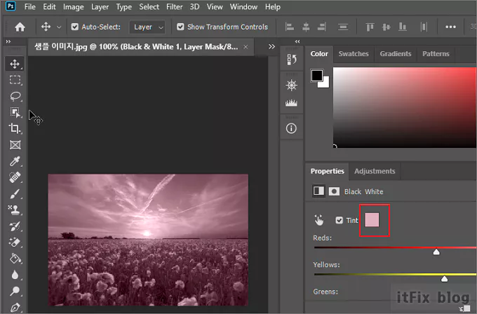 이렇게 하면 이미지가 흑백으로 변합니다. 이 상태에서 tint(색조)에 체크 표시를 해 준 다음, tint 옆에 있는 조그만 색상 박스를 클릭한 다음 원하는 색으로 조정하여 특정 톤으로 보정합니다.