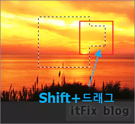 - 선택영역이 지정된 상태에서 추가로 Shift+드래그 : 원본 선택 영역에 새로운 선택 영역 추가하기