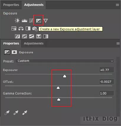 상단 메뉴에서 Exposure 메뉴를 사용할 수 없거나 원본과 별개의 노출 레이어를 생성해 수정하고자 하는 경우에는 우측의 Adjustments 패널에서 Exposure 아이콘을 클릭한 다음 Properties 창에서 슬라이드바를 이용해 노출 또는 오프셋 등의 값을 조절합니다.
