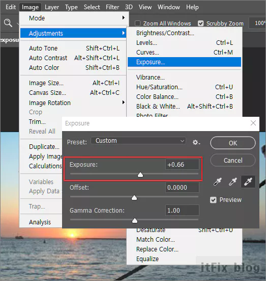 포토샵에서 샘플 이미지를 불러온 다음 Image > Adjustments > Exposure 메뉴를 클릭합니다.