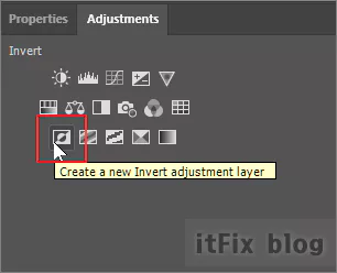 다른 효과들과 마찬가지로 Invert 역시 우측의 Adjutsments 패널에 있는 Invert 아이콘을 클릭하여 실행하지만 특별히 조절할 옵션이 없으므로 Properties 패널에는 아무런 옵션이 없습니다.