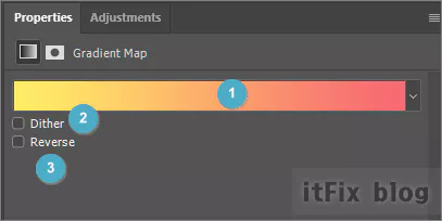 Properties 패널에서 그라디언트 맵의 메뉴는 아래와 같이 구성되어 있습니다.