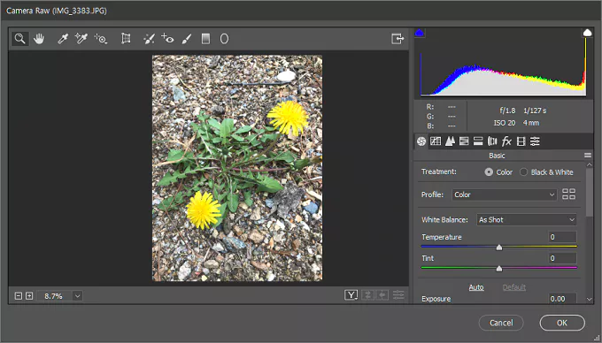 촬영한 사진을 포토샵에서 불러온 다음 상단 메뉴의 Filter > Camera Raw Filter를 클릭하면 별도의 Camera Raw 대화창이 팝업 됩니다.