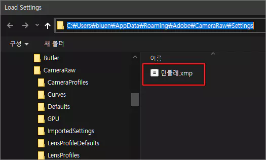 xmp 파일의 기본 저장 경로는 'C:\Users\계정이름\AppData\Roaming\Adobe\CameraRaw\Settings'이지만 원하는 사용자 폴더에 저장할 수도 있습니다. 저는 작업 내용을 민들레라는 이름의 xmp 파일로 저장해 보았습니다.