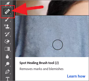 인물 사진을 불러온 다음 좌측의 도구 막대에 있는 마치 상처에 붙이는 밴드처럼 생긴 Spot Healing Brush Tool을 클릭하여 선택합니다.