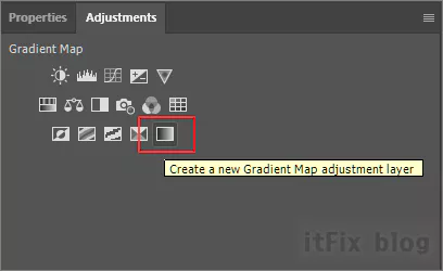 본격적으로 그라디언트 맵 듀오톤 작업을 해주기 위해 이번에는 우측의 Adjustments 패널에서 Gradient Map 아이콘을 클릭합니다.