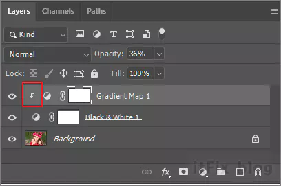 그러면, 그라디언트 맵 레이어 왼쪽에 아래로 꺾인 모양의 화살표가 표시되면서 클리핑 마스크가 설정되었음을 알려 줍니다.