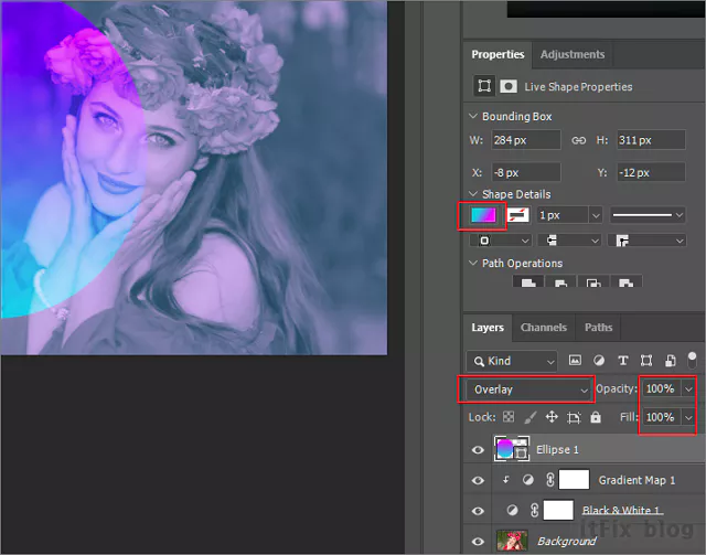 Shape Details에서 원형 속에 들어갈 색상이나 그라디언트를 설정해 준 다음 레이어의 블렌딩 모드 옵션을 Overlay로 지정해 줬습니다.