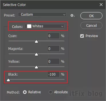 강조할 색상은 흰색을 지정해 준 다음, 흰색의 보색인 검은색의 강도를 -100까지 낮추어 줍니다.